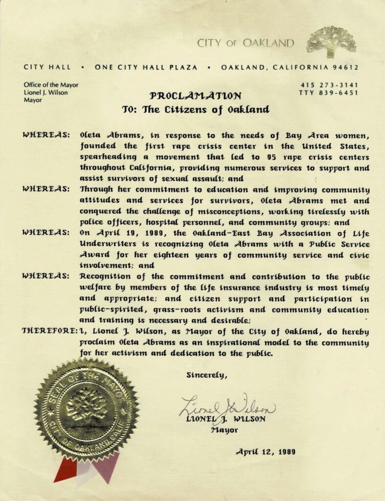 Oleta Kirk Abrams, who co-founded the nation’s first rape crisis center after her foster daughter was sexually attacked in a Berkeley High stairwell, died Jan. 8 from medical complications during a lung biopsy at Alta Bates Summit Medical Center. She was 77.