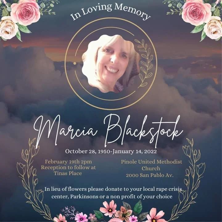 Marcia Blackstock was the longtime Executive Director of Bay Area Women Against Rape (BAWAR), the first rape crisis center in the United States. For 35 years, she provided unyielding support to survivors while transforming how the criminal justice system responds to sexual assault. Marcia championed expanded funding for rape crisis services statewide, helped change laws to strengthen protections for survivors, and inspired thousands of volunteers to serve as Rape Crisis Advocates. Under her leadership, BAWAR supported hundreds of thousands of survivors with counseling, advocacy, and education. Following her passing on January 14, 2022, Marcia is remembered as a visionary leader whose impact continues to shape the movement against sexual violence.